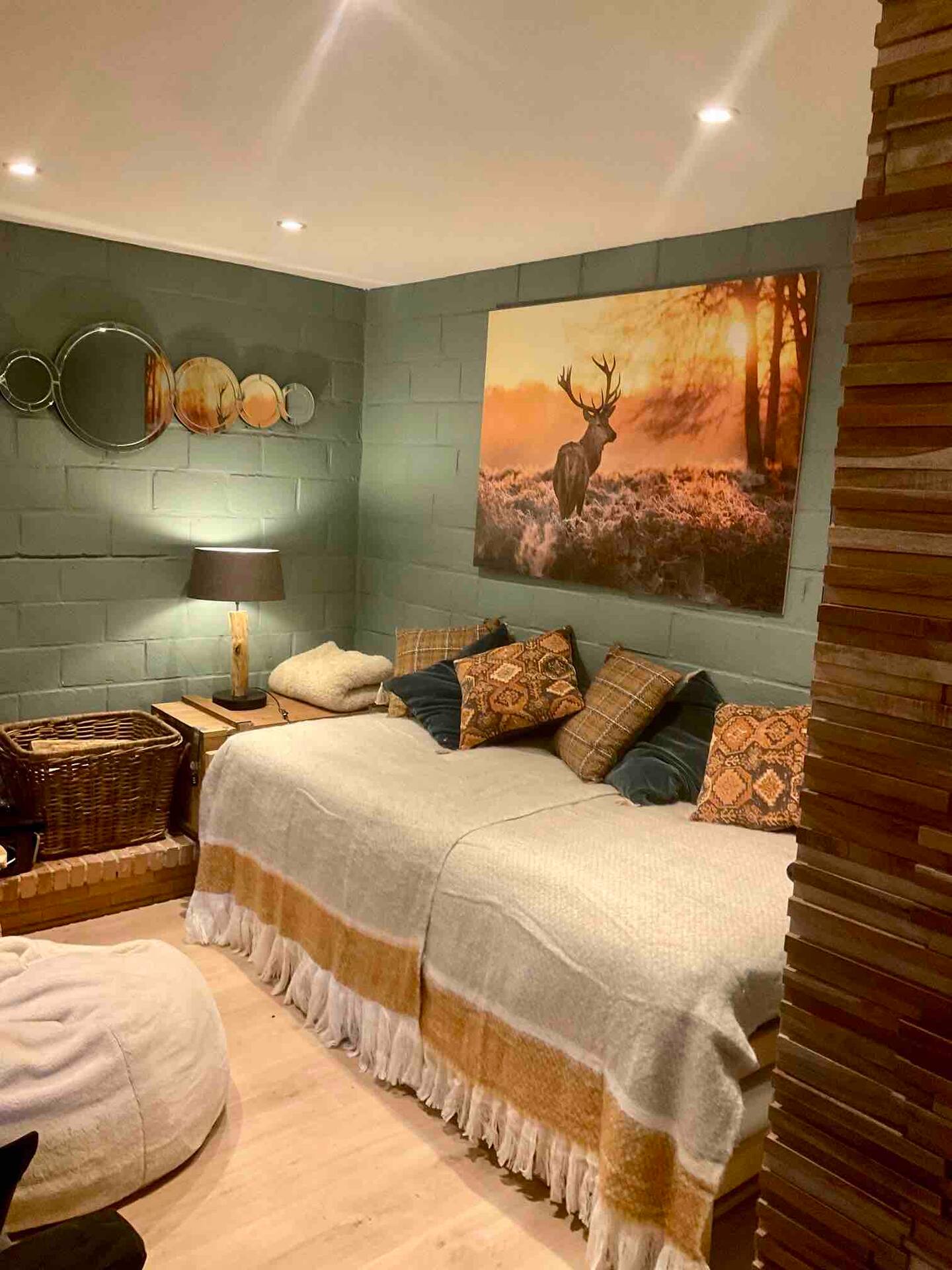 Le Woody Lodge, avec sa mezzanine spacieuse et son poêle à bois panoramique, est particulièrement apprécié en automne et en hiver. Situé dans le bas du domaine, tout proche de la Meuse, il permet d’observer le ballet des brumes matinales qui s’élèvent de la rivière. Son architecture chaleureuse et ses matériaux naturels créent une atmosphère cosy, en parfaite harmonie avec l’environnement forestier.